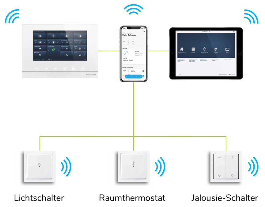 per Schalter, aber natürlich auch vom Tablet, Smartphone oder Computer aus, per WLAN von nah und fern. Sensoren, Aktoren und Steuerung werden im GO intelligent miteinander verknüpft, konventionell per Kabel oder kabellos.